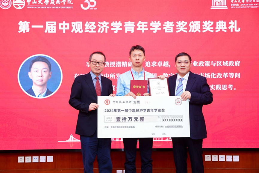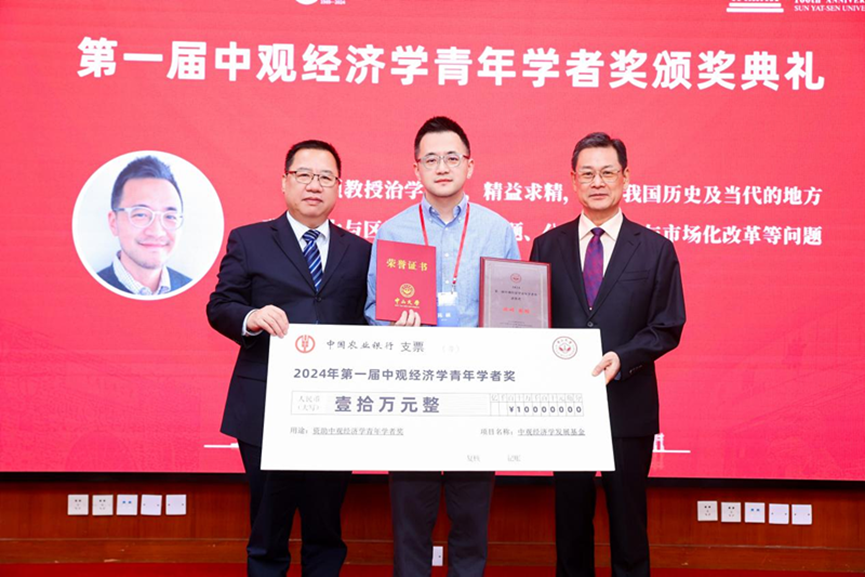 随后,会议颁发了第一届“中观经济学青年学者奖”。中山大学经管学部主任李善民教授介绍了该奖项的设立及评审情况,向陈云贤教授为推动中观经济学学科建设作出的突出贡献表示敬意。李善民教授指出,中观经济学致力于探索区域政府经济行为,推动中国自主经济学知识体系的建设和发展。为促进区域政府经济行为领域的青年学者成长,并产生未来30年有较强国内外影响力的理论创新成果,中山大学于2024年设立“中观经济学青年学者奖”,以表彰该领域青年学者的理论贡献。该奖项每年评选一次,每次1-2名,每位获奖者在评选当年一次性获资助金额10万元人民币,其指导的博士生团队次年获资助金额5万元人民币。