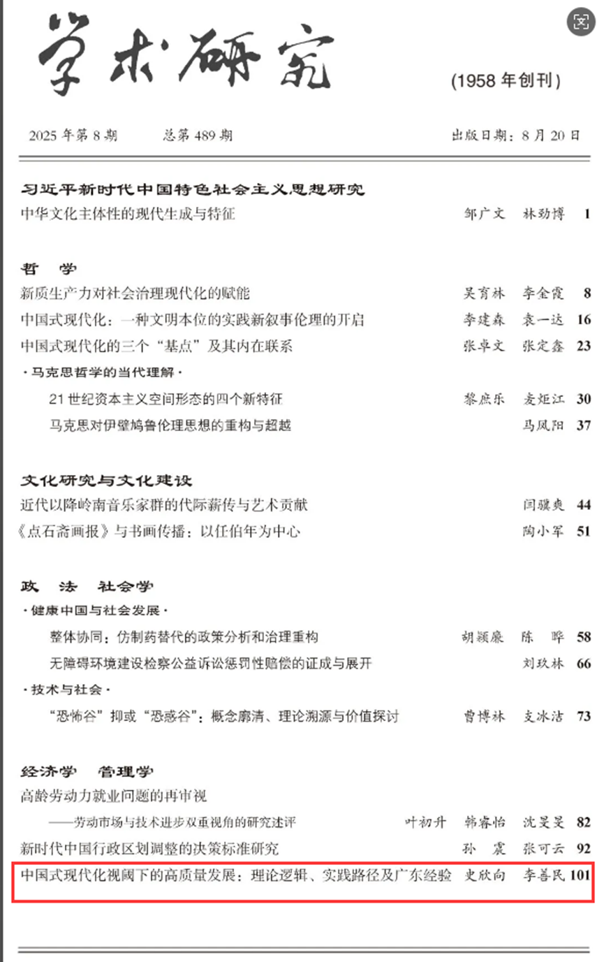 近日,实验室主任李善民教授与合作者中山大学自贸区综合研究院副院长史欣向在核心期刊《学术研究》2025年第8期发表学术论文《中国式现代化视阈下的高质量发展:理论逻辑、实践路径及广东经验》。