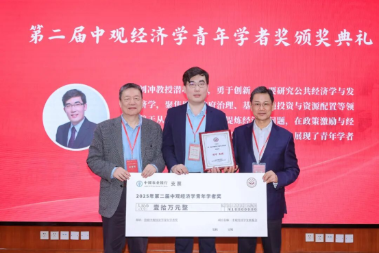 李善民教授、林建浩教授为第一届“中观经济学青年学者奖”博士团队代表颁奖