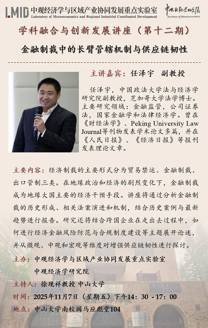 讲座预告 | 学科融合与创新发展讲座(第十二期)金融制裁中的长臂管辖机制与供应链韧性
